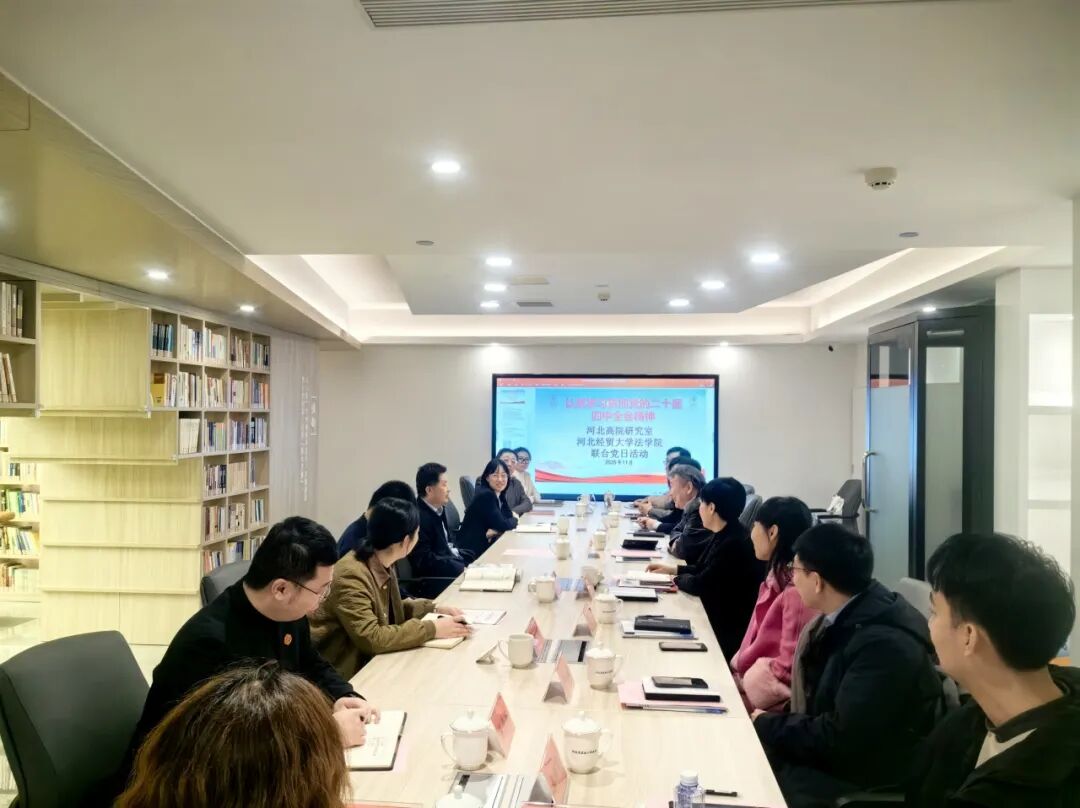 为深入学习贯彻党的二十届四中全会精神,推动党建工作与法治业务同频共振、深度融合,11月24日上午,tyc7111cc太阳成集团党委书记黄华、院长胡海涛带队,与基础法学教研室党支部一行九人赴河北省高级人民法院开展党建联建活动。省法院研究室全体同志全程参与,共同搭建校院合作新桥梁。